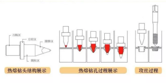 上圖很好的展示了熱熔鉆孔攻絲的整個(gè)加工過(guò)程,通過(guò)特殊處理過(guò)的熱熔鉆頭,在高速旋轉(zhuǎn)接觸到金屬材料表面的瞬間,會(huì)產(chǎn)生600℃-800℃的高溫,高溫軟化金屬的同時(shí),高速主軸帶動(dòng)熱熔鉆頭快速旋轉(zhuǎn)下壓,被擠壓的那部分金屬沿著圓孔朝上下延伸,形成比原金屬厚度三倍左右的厚壁層。熱熔鉆孔的整個(gè)加工過(guò)程不會(huì)破壞金屬材料的結(jié)構(gòu)和性能,同時(shí)形成的厚壁層具有抗扭力/拉力的性能,可以直接進(jìn)行高質(zhì)量的無(wú)屑攻絲。